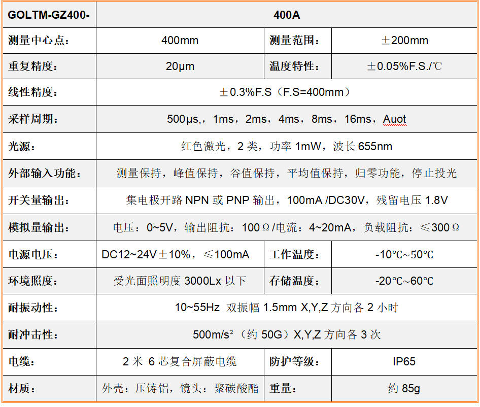 GOLTM-GZ400-400A型牢固脉冲光测距仪常用于高精密度、高传输率的测量产品工件位移、面积、位置及位置差,设备程序调试概括,数码科技出现绝对化性间断或绝对化性间断,具备条件摹拟量放入及电开关量放入。● 激光三角形(xing)丈量道理,高精度、高速(su)率(lv)、高活络度丈量细小位移